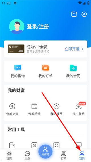 2、點擊我的進入個人界面,可進行登錄、注冊,登錄后可成為VIP會員,查看我的咨詢、訂單、合同,進行余額充值、查看余額明細,使用常用工具。