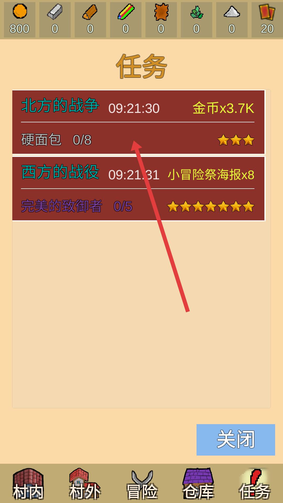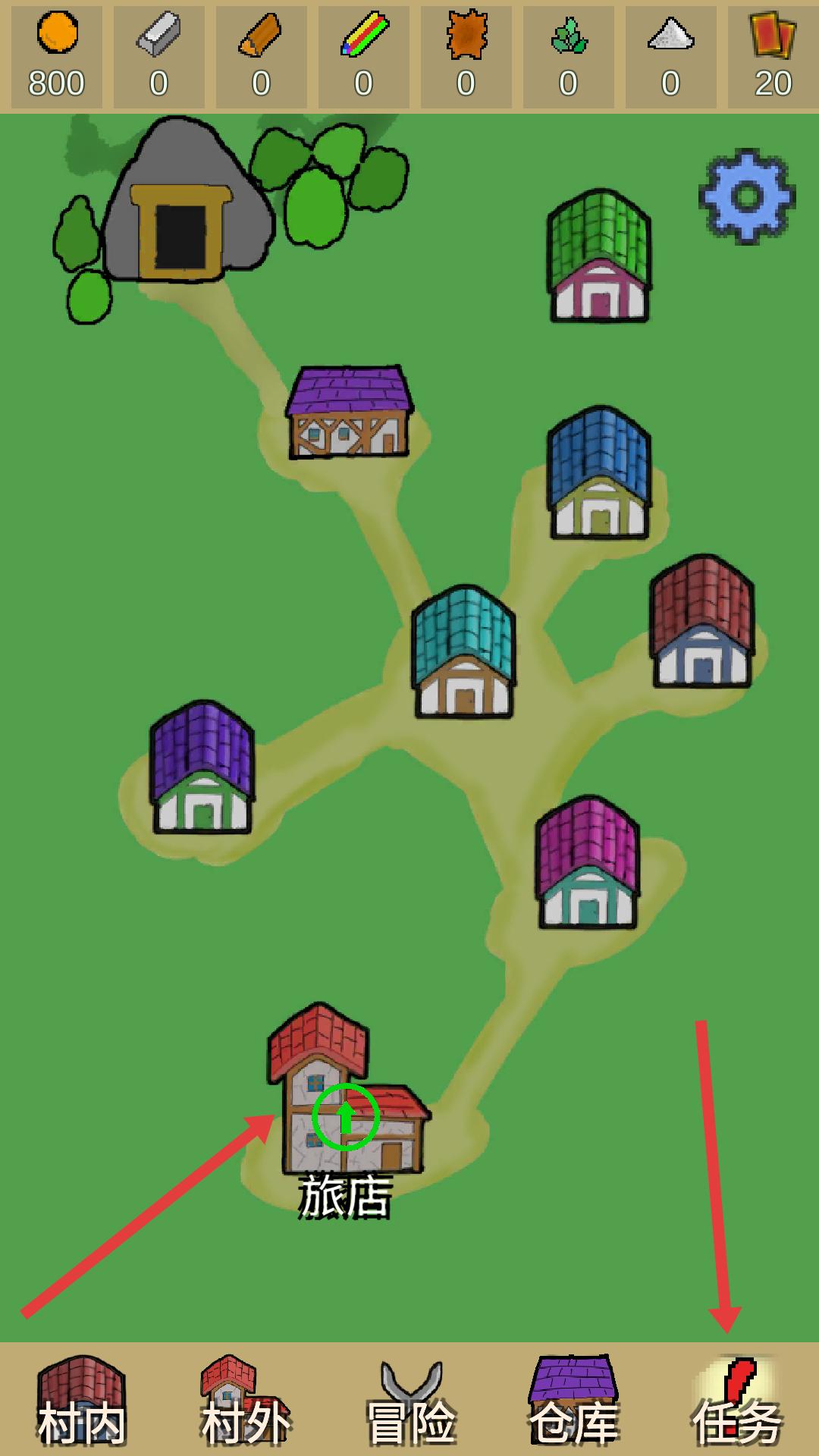 1、進入游戲后觀察村內建筑,看到有旅店,下方還有村外地圖,也可以外出冒險或查看任務,助力游戲進程。