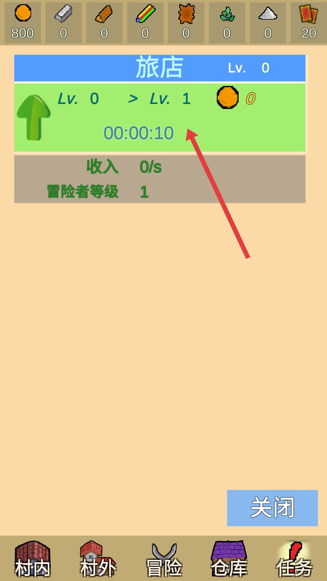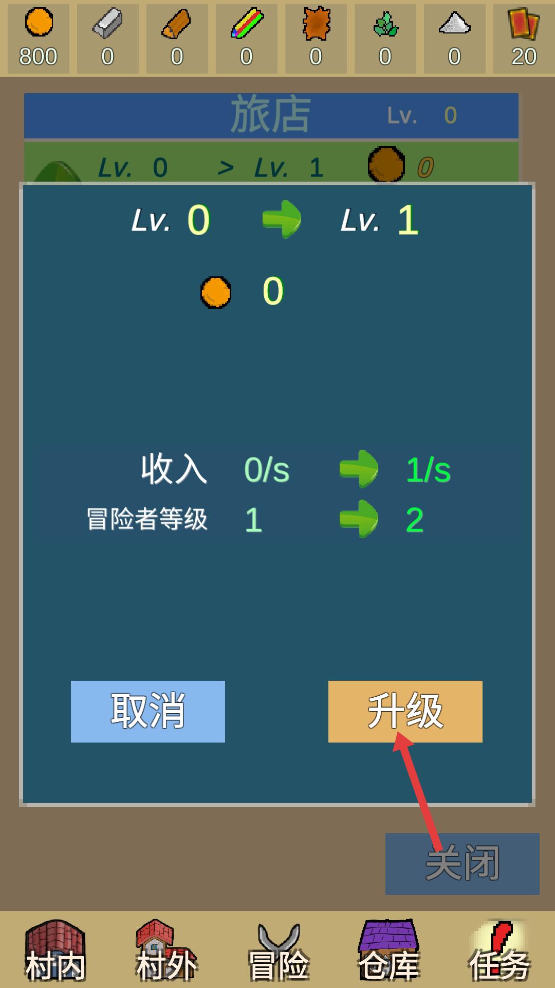3、當旅店滿足升級條件會彈出升級界面,點擊升級按鈕可提升旅店等級,增加收入和冒險者等級上限。