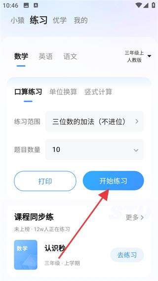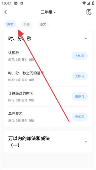 2、在練習內容選擇界面,若選數學學科,能看到時、分、秒等知識點分類,還有萬以內的加法和減法等單元,可選擇對應知識點去練習。