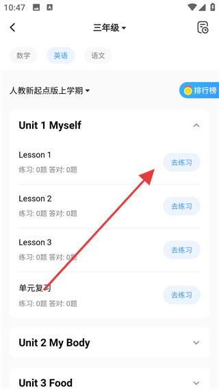 3、若切換到英語學科,會顯示不同單元內容,每個單元下有多個Lesson,點擊對應Lesson右側的去練習,進入英語練習界面。