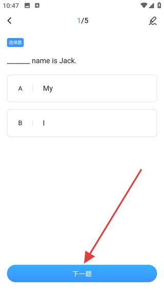 4、進入英語練習界面,會出現選擇題等題型,完成當前題目后,點擊下一題,可繼續進行后續題目練習,逐步完成該部分練習內容。