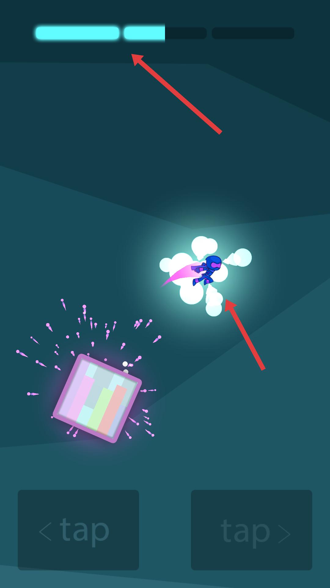 3、游戲過程中忍者會遇到帶有彩色條紋的方塊,需操控忍者撞擊方塊,使其破碎,推進關卡進度。