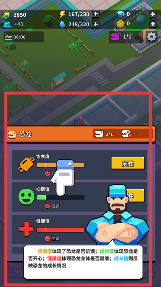 4、恐龍擁有飽食度、心情值、健康值等屬性,要關注這些數值,當飽食度低時點擊前往喂食,心情值差或健康值低時,采取相應措施保障恐龍狀態良好。