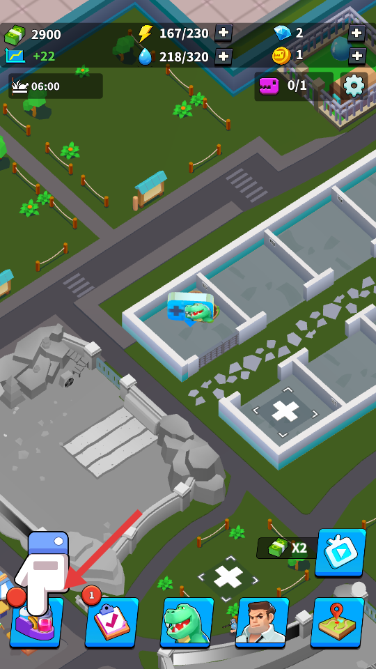 2、建造好牢籠后可在場景中看到恐龍所在的牢籠,點擊左下角帶有數字1的圖標,能查看相關任務或恐龍狀態,可以推進游戲進程。