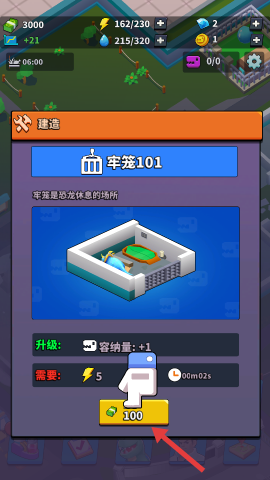 1、點擊花費100綠色貨幣的按鈕建造牢籠101,牢籠是恐龍休息的場所,建造后可容納恐龍,為后續養恐龍做準備。
