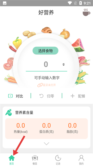 1、首頁可選擇食物并手動輸入重量,查看熱量、蛋白質、脂肪等營養素含量,具備對比、歸零、配餐功能。