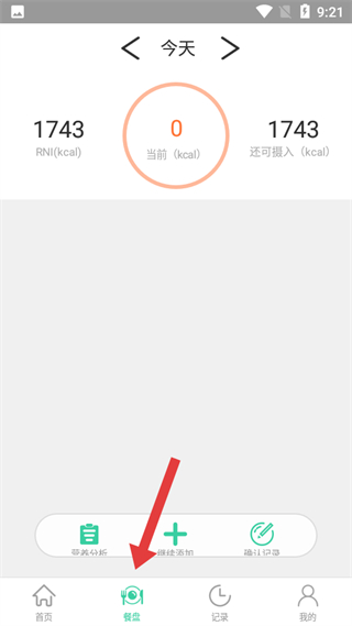 2、餐盤板塊,展示每日熱量攝入情況,有RNI、當前攝入量和還可攝入量,提供營養分析、繼續添加和確認記錄功能。
