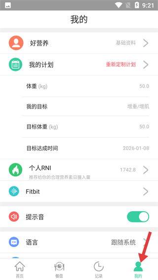 4、我的板塊,可查看個人資料、營養計劃,設置體重、目標等,管理個人RNI、設備、提示音和語言,實現個性化營養管理。