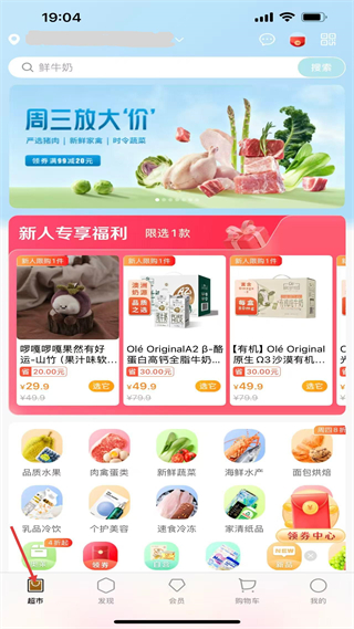 1、超市板塊首頁,提供商品分類與新人福利,包含周三促銷活動,可通過搜索欄快速找商品,是日常采購的核心操作界面。