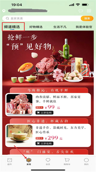 2、點擊底部超市標簽,進入超市頻道,有靈感食譜、領券中心等板塊,好物精選展示酒類等商品。