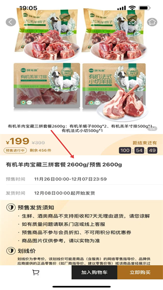 4、商品詳情頁,展示有機羊肉套餐信息,含預售時間、發貨規則等,支持加入購物車或立即購買,需留意生鮮商品售后規則。