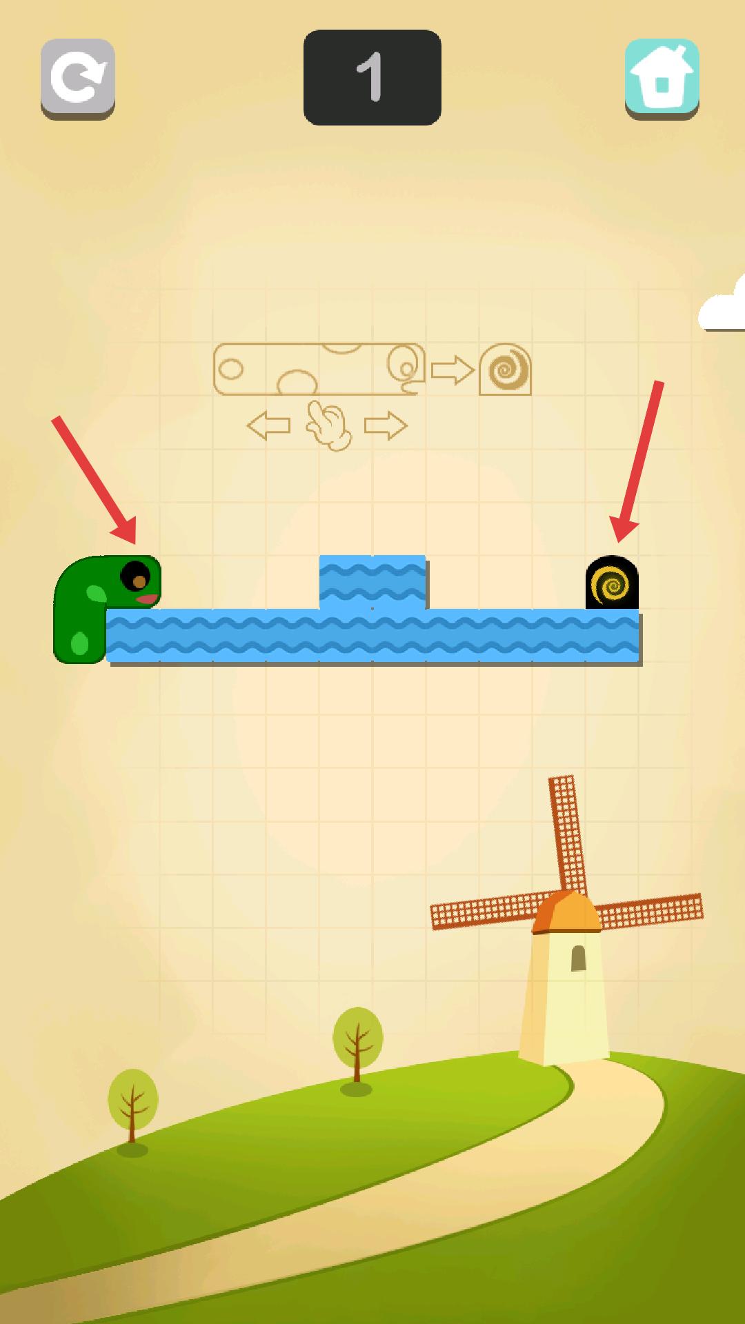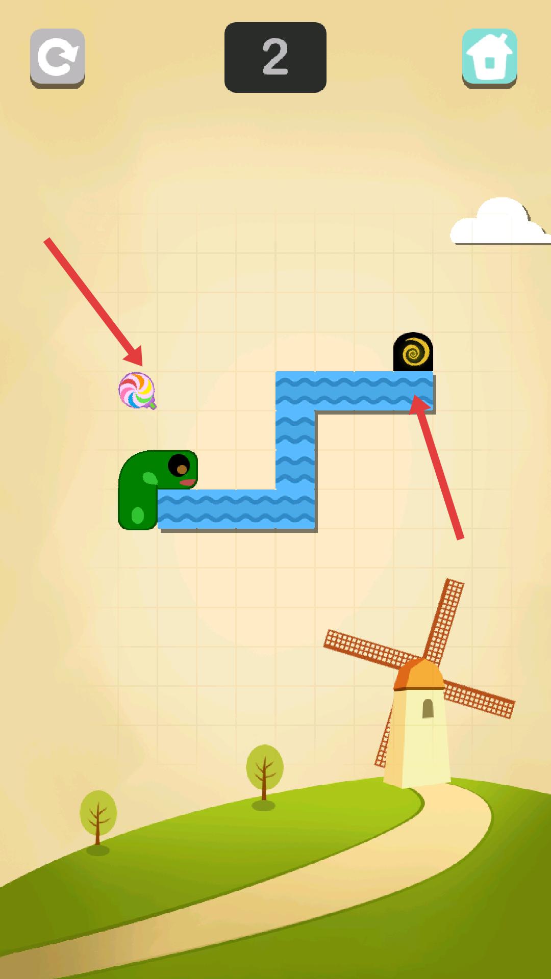 2、進入第一關,綠色甜甜蟲需在藍色路徑上移動,目標是到達右側的黑色漩渦處,要控制好甜甜蟲的移動方向。