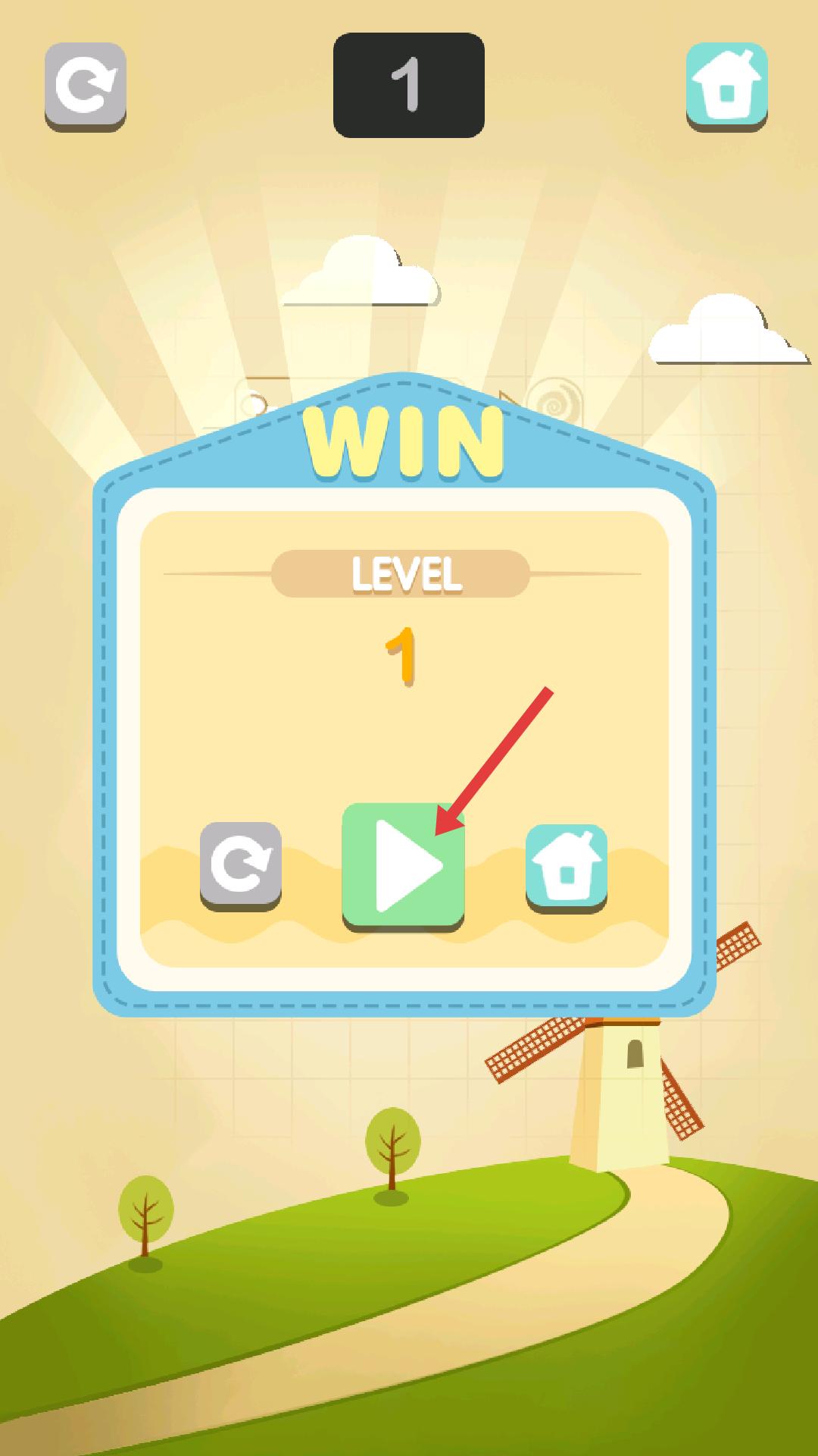 3、成功讓甜甜蟲到達黑色漩渦后,會顯示WIN界面,點擊中間帶有白色三角形的綠色按鈕,可進入下一關。