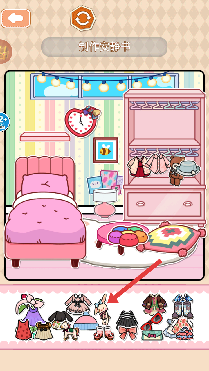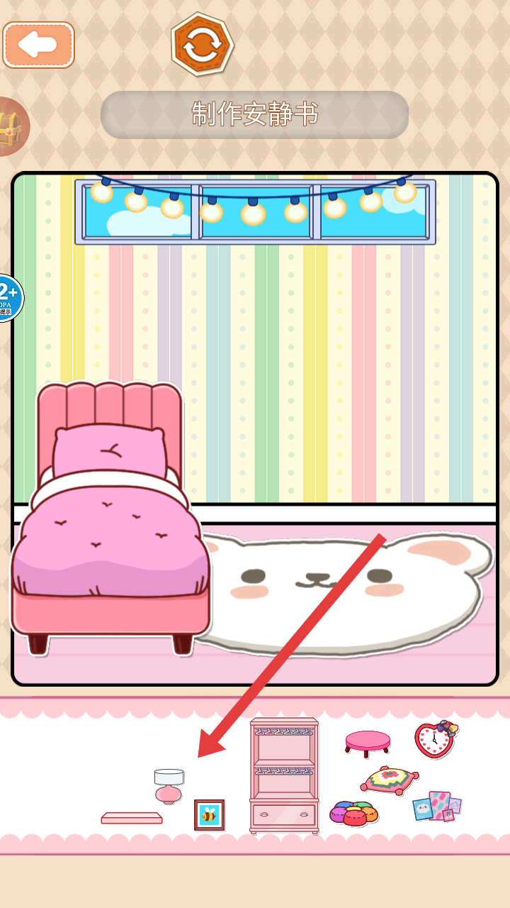 2、點擊制作安靜書,進入具體的制作場景,會看到如臥室等場景畫面,以及下方的各類家具、裝飾等道具。