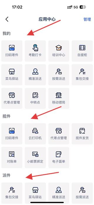 3、進入應用中心查看我的、攬件、派件等功能分類,如掃碼寄件、考勤打卡、集包交接等,了解軟件的功能模塊,根據需求使用相應功能,提升快遞業務處理效率。