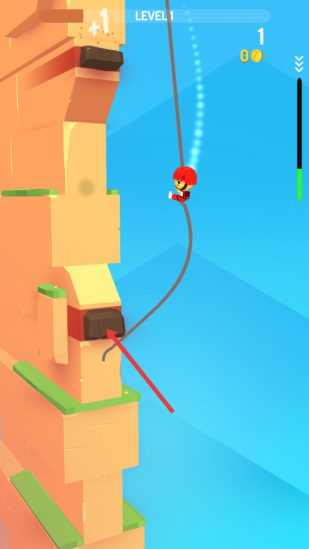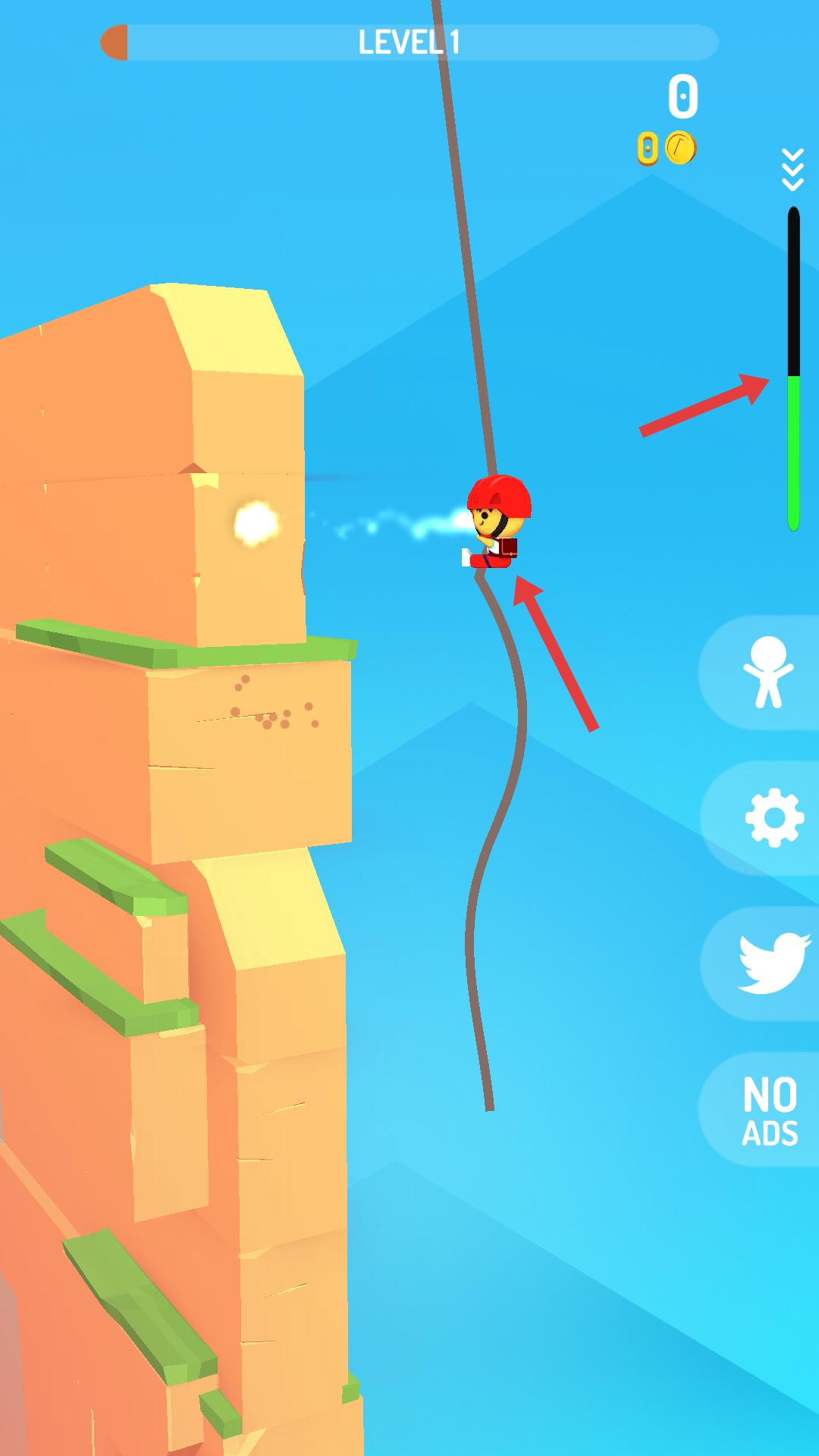 1、進入第一關,操控戴紅色頭盔的角色沿繩索下滑,右側進度條顯示當前狀態,要注意觀察周圍環境。