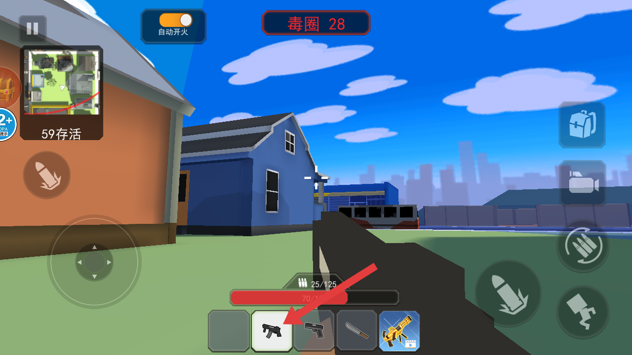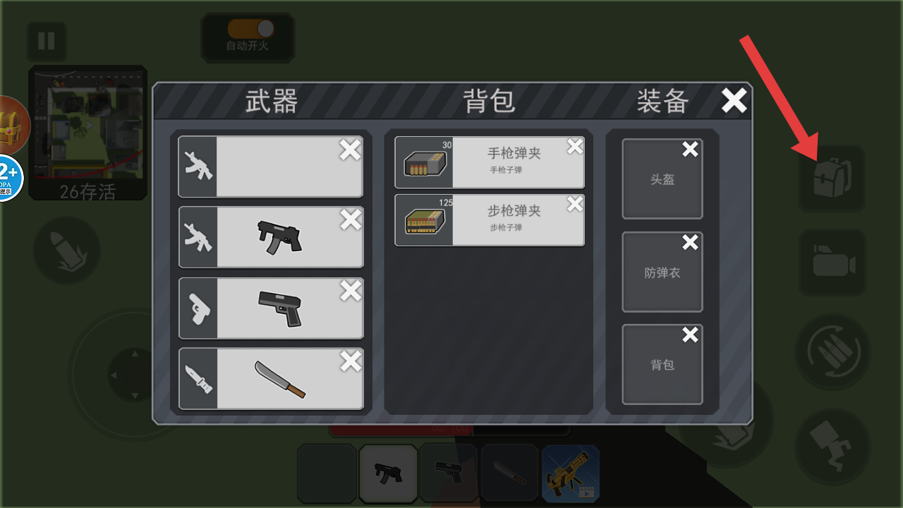 4、點擊背包按鈕,可查看和管理武器、彈夾等裝備,合理調配,讓自己更具競爭力,力爭存活到最后。