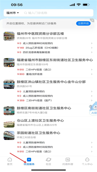 2、優選服務板塊,可查看福州附近門診及疫苗預約信息,如福州市中醫院賢南分診部等門診的疫苗種類及價格,助力用戶選接種點。
