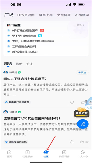 3、社區頁面廣場板塊匯聚多元話題,HPV交流圈、疫苗上岸等話題下,熱門討論實時更新,用戶可參與互動、分享經驗,關注達人獲取疫苗優惠。