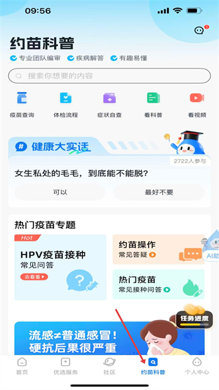 4、約苗科普板塊,有疫苗查詢、體檢流程等功能,還有健康問答和熱門疫苗專題,為用戶普及疫苗及健康知識。