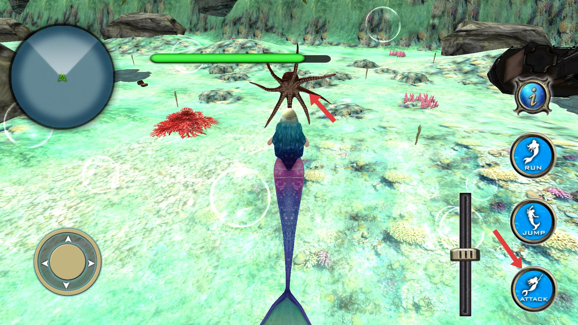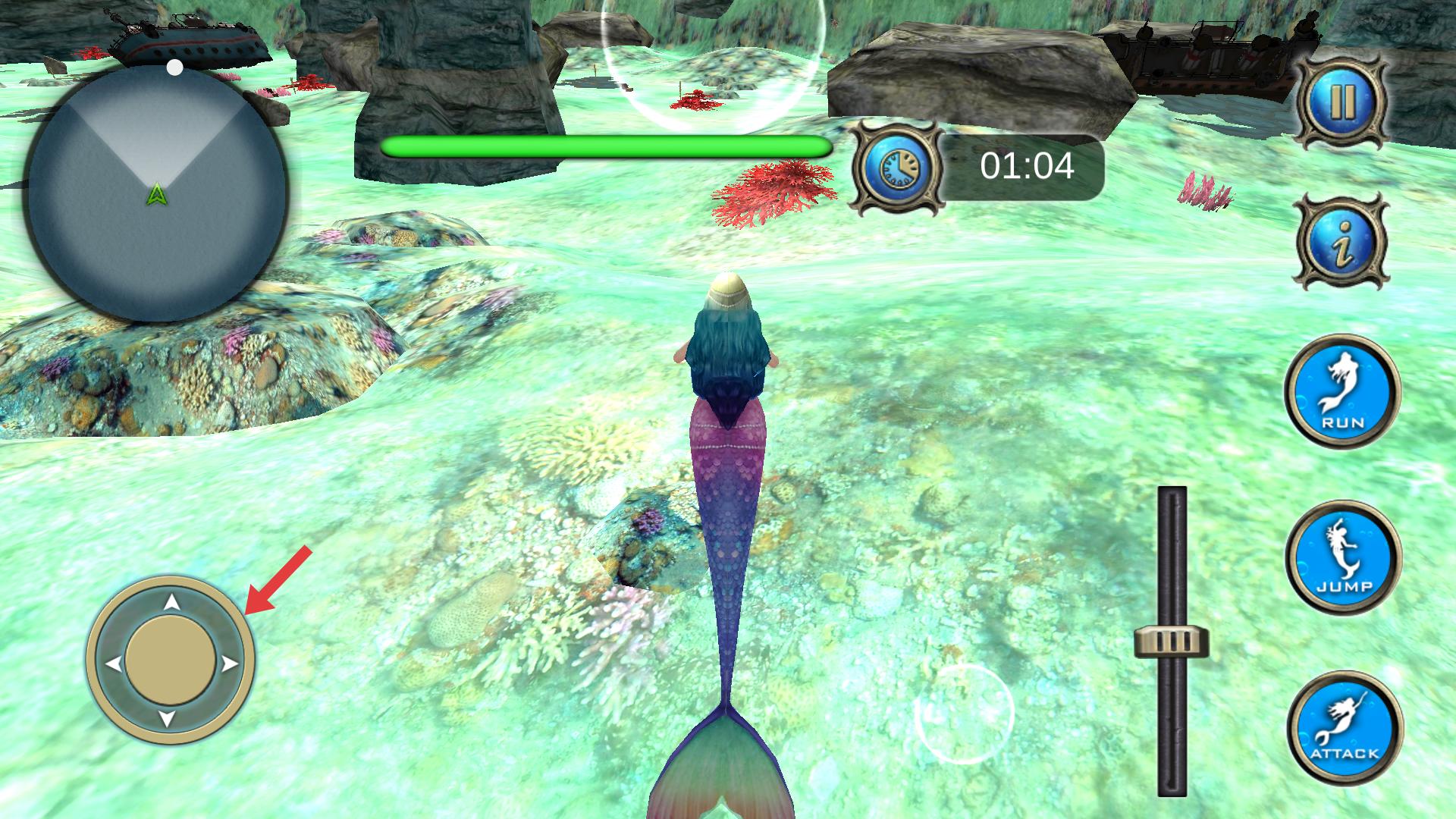 2、在海底場景,通過左下角搖桿控制美人魚移動,靈活穿梭,躲避障礙,尋找狩獵目標。