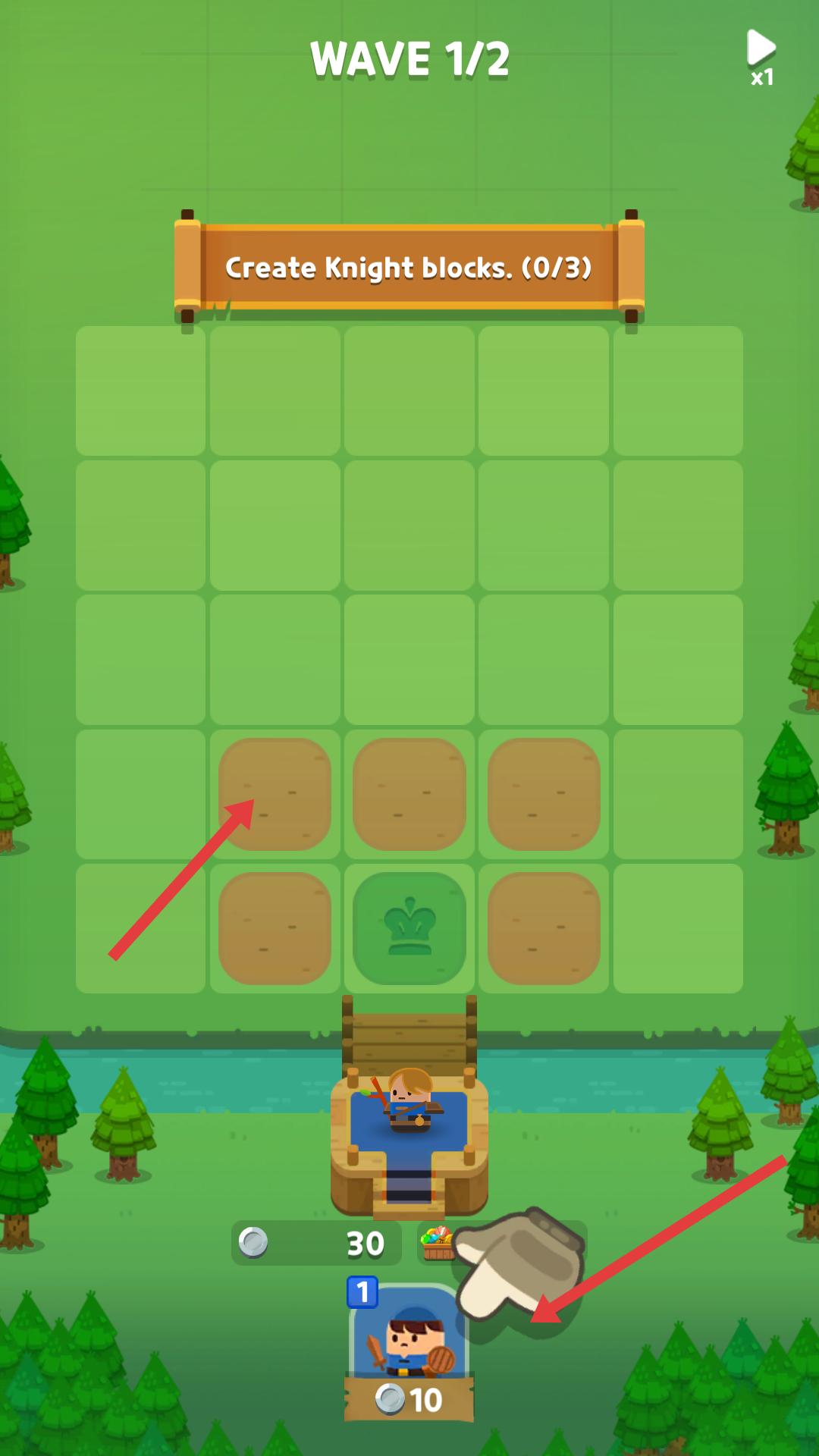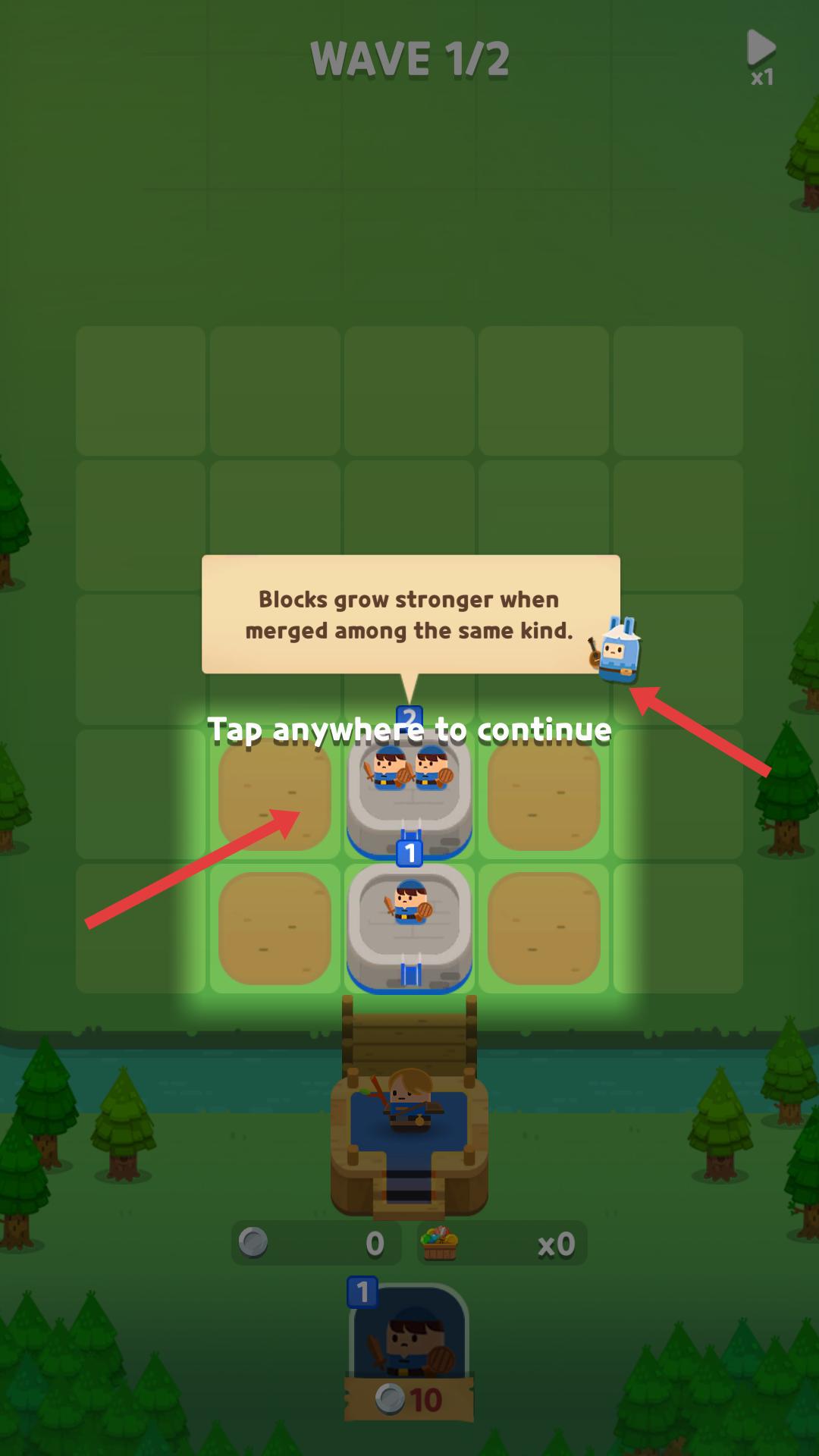 2、創建騎士方塊后,會看到游戲給的提示,點擊任意位置繼續,可合并同種類方塊增強實力。