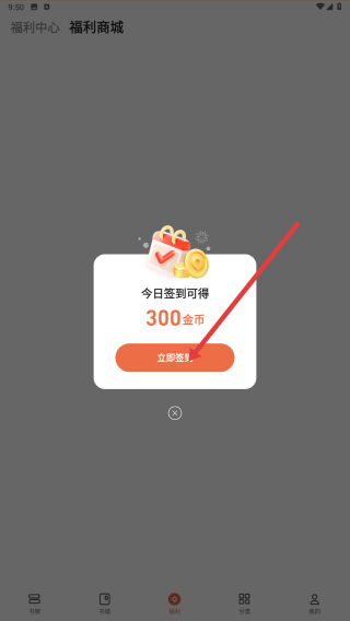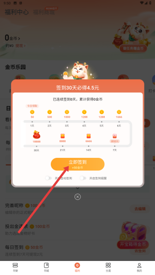 2、點擊底部福利,進入福利中心,會彈出簽到領金幣的窗口,可點擊立即簽到。