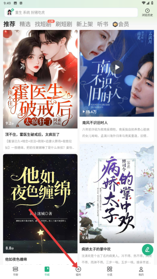 1、進入APP首頁,有推薦、精選等分類,能看到霍醫生破戒后太瘋狂了、他如夜色纏綿等多部小說,可挑選感興趣的閱讀。