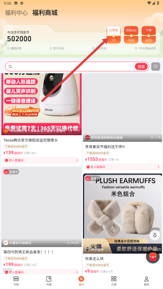 4、進入福利商城,能看到可用金幣兌換的商品,如攝像頭、耳罩等,也可查看已簽到天數等信息。