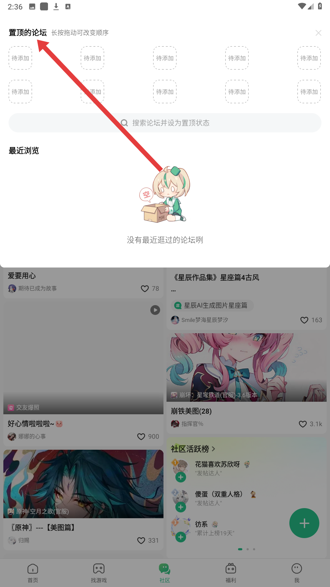 2、社區板塊可設置置頂的論壇,方便快速訪問常逛論壇,也可查看最近瀏覽的論壇記錄。