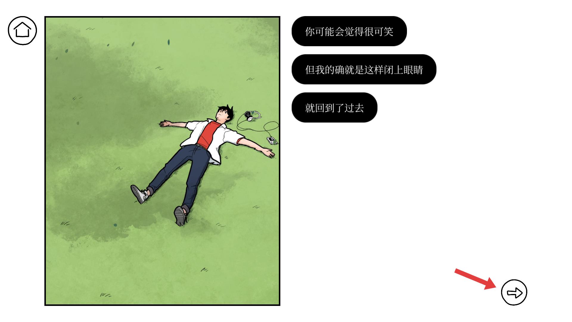 2、閱讀角色躺在草地的劇情文字后,點擊右下角箭頭按鈕,推進故事,解鎖后續回到過去的情節。