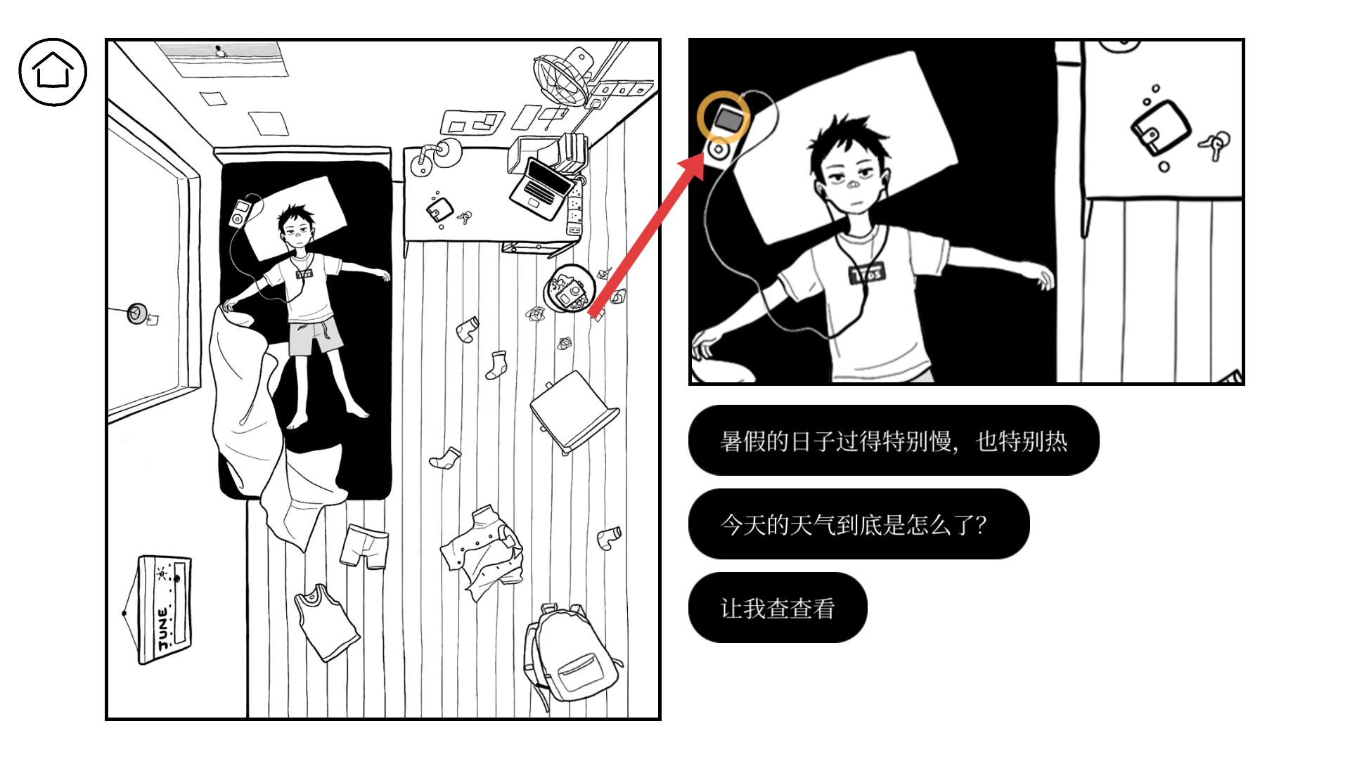 4、在黑白房間場景,關注箭頭指向的隨身聽,互動該物品,解鎖暑假相關劇情,探索天氣等故事線。
