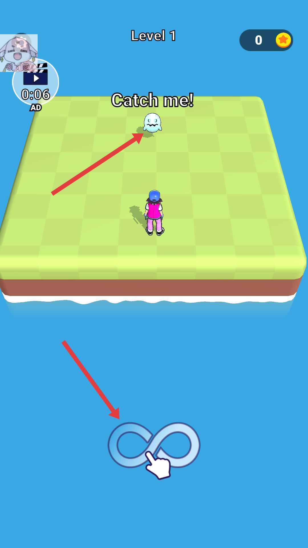 1、Level1時,點擊下方無限符號按鈕,控制角色移動,追趕幽靈,成功捕捉推進關卡。