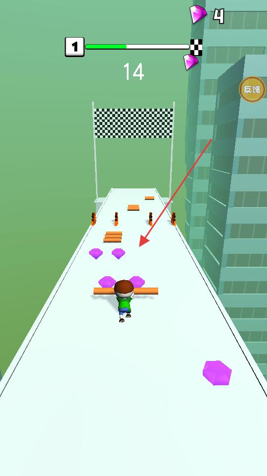 3、持續操控角色奔跑收集更多的紫色寶石,朝著賽道終點前進,此時注意終點前的障礙物和寶石分布,爭取高效收集寶石并到達終點。