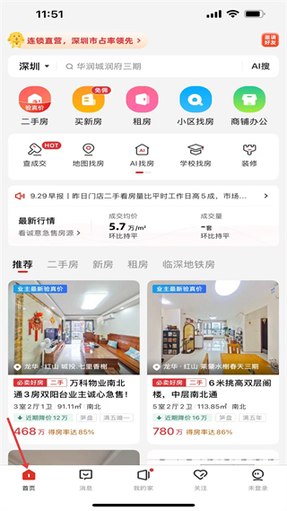1、進入界面看到深圳區域的房產首頁,有二手房買新房租房等功能按鈕,還有最新行情板塊和推薦房源,先熟悉這些功能入口,準備開啟找房相關操作。