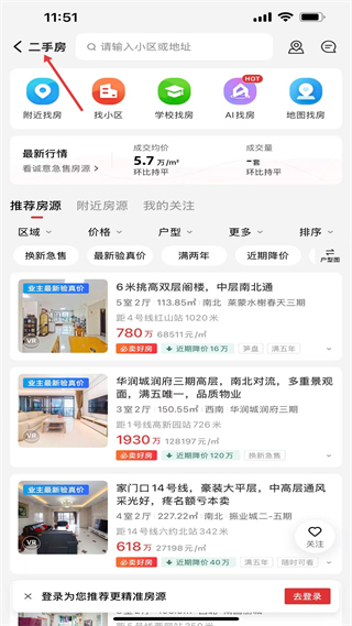 2、點擊二手房按鈕進入對應頁面,能看到附近找房等功能選項,還有最新行情和推薦房源列表,可通過區域價格等篩選,精準查找心儀房源。