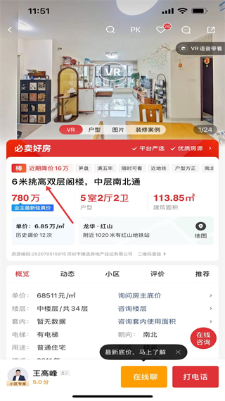3、點擊心儀房源進入詳情頁,能看到VR看房選項和房源的價格戶型面積等信息,還有中介聯系方式,可了解房源細節并咨詢相關情況。