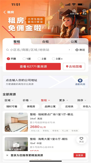 4、切換到租房頁面能看到整租合租公寓的選項,還有搜索欄和篩選條件,下方展示各類租房房源,可根據自身需求查找合適的租賃房源。