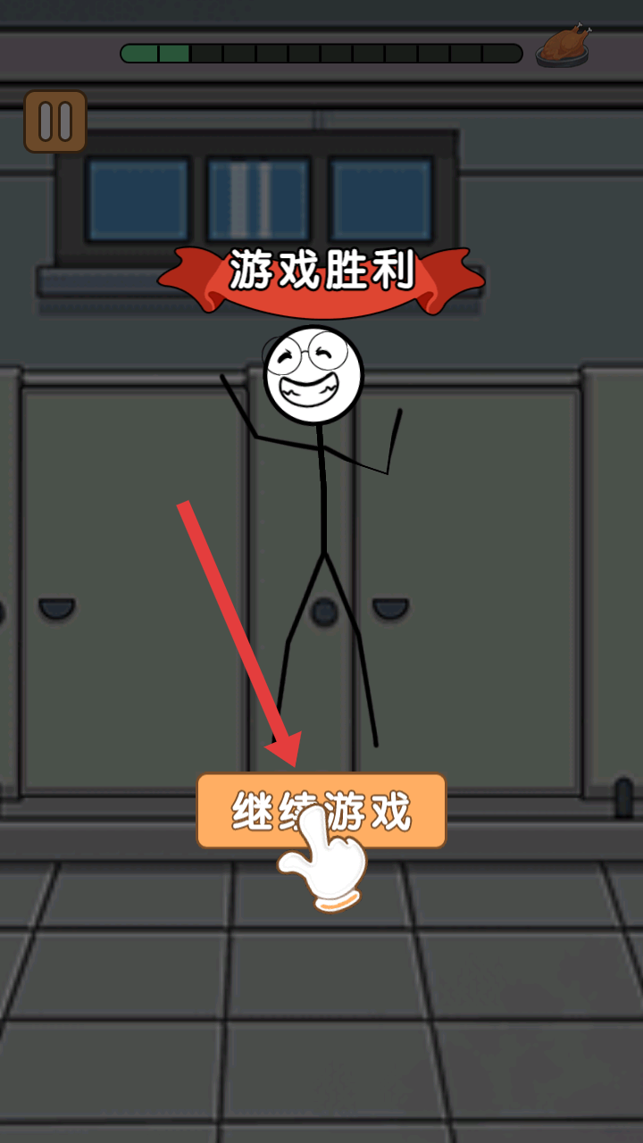 4、順利完成這一系列操作后,顯示游戲勝利,點擊繼續游戲,開啟火柴人下一段辦公冒險。