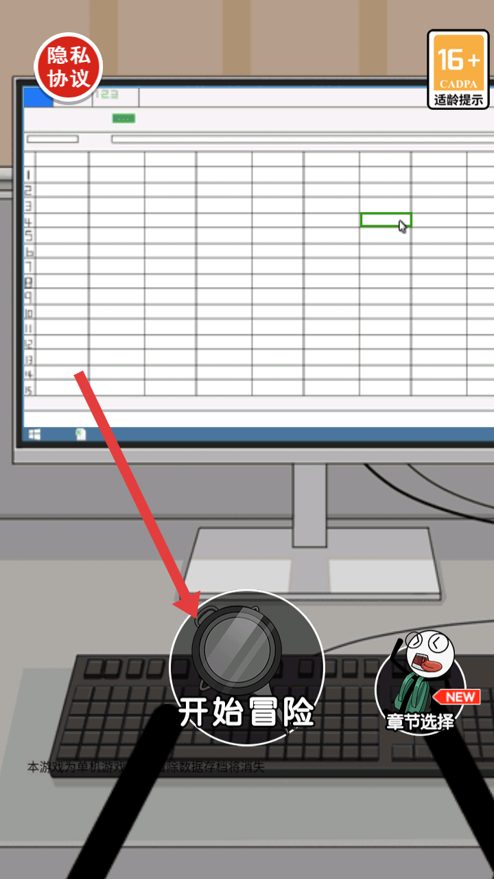 1、進入游戲,點擊開始冒險,開啟火柴人辦公場景偷偷溜走不加班的冒險,躲避領導的追捕。