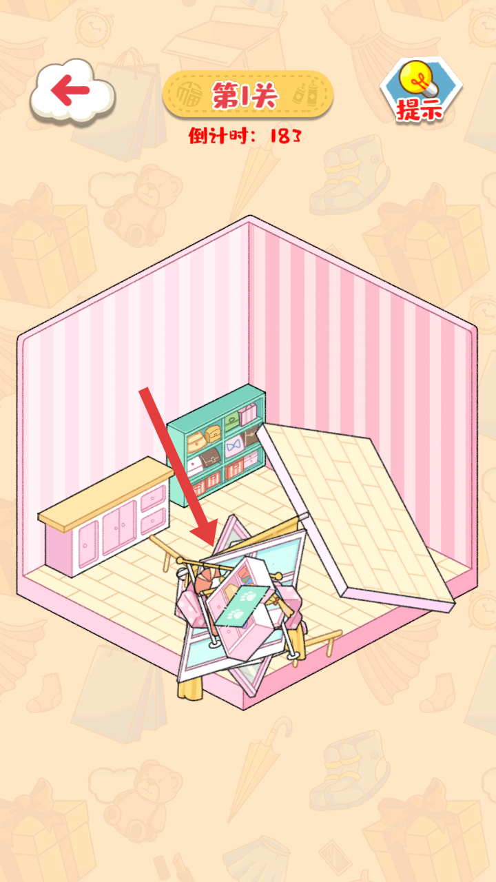 2、來到第1關,房間內物品雜亂堆放,需要倒計時183秒內,將這些物品進行整理收納。