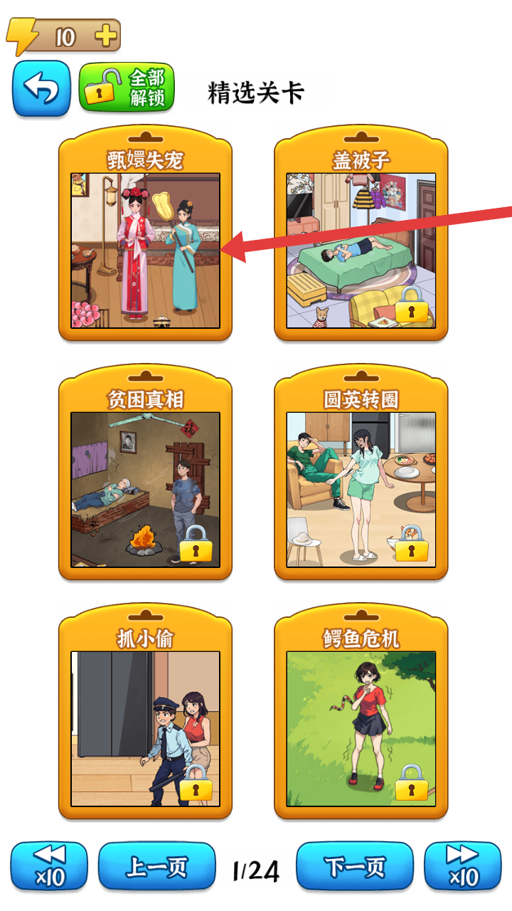 1、進入游戲能看到精選關卡界面,有甄嬛失寵、蓋被子等不同主題關卡,可選擇喜歡的關卡開啟解謎。