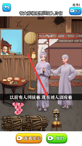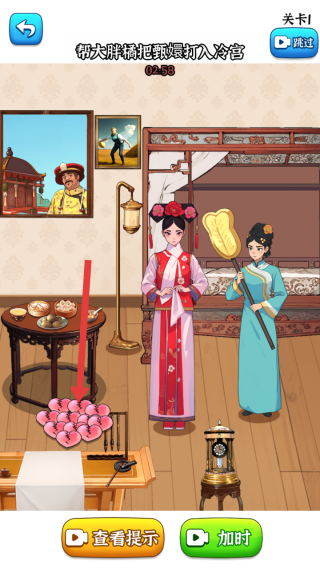 2、以甄嬛失寵關卡為例,進入后界面顯示幫大胖橘把甄嬛打入冷宮,需場景中尋找關鍵物品或線索。