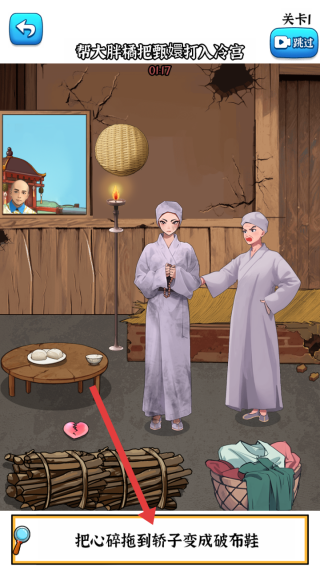 4、繼續按照提示,把心碎拖到轎子變成破布鞋來操作,逐步推進,完成幫大胖橘把甄嬛打入冷宮的關卡目標。