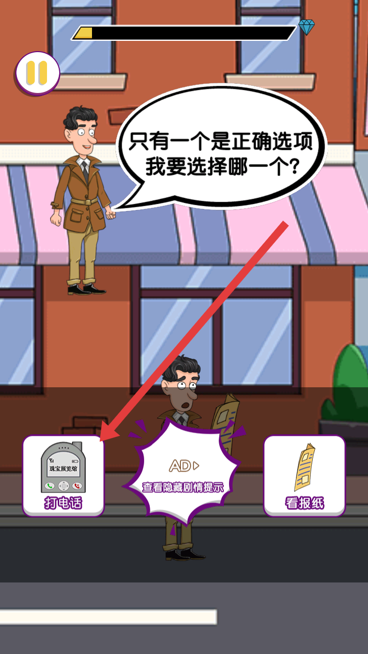 1、游戲中會出現選擇場景,像面臨只有一個是正確選項,要選哪一個的問題,需從打電話、看報紙等選項里選正確的。