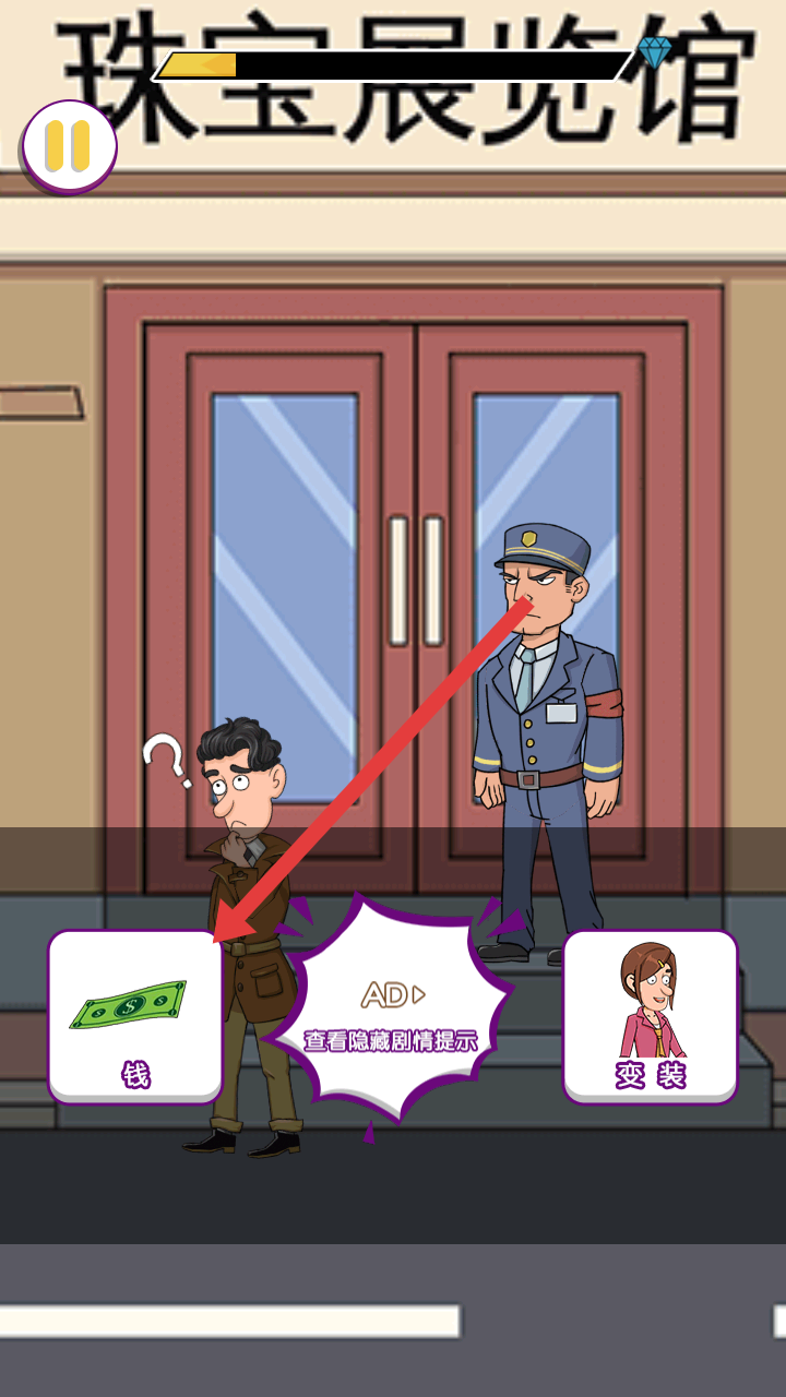 2、選對了會出現下一個場景,珠寶展覽館相關場景,會有給錢或變裝等選擇,要選對才能推進劇情。