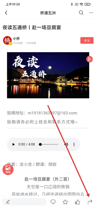 3、進入文章詳情頁后可播放附帶的音頻內容,查看文章的文字信息,使用評論點贊等功能互動,也可點擊分享按鈕準備傳播該內容。