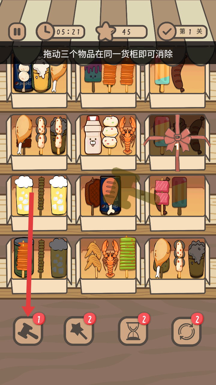 2、若遇到難以消除的物品,可點擊下方錘子道具,使用錘子能幫助消除特定物品,推進游戲進程。