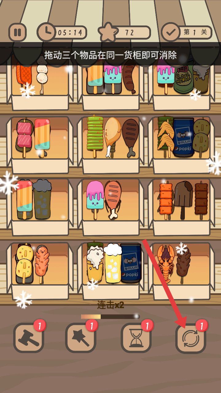 4、當物品布局不利于消除時,點擊下方刷新道具,能重置貨柜里的物品排列,創造更好的消除機會。